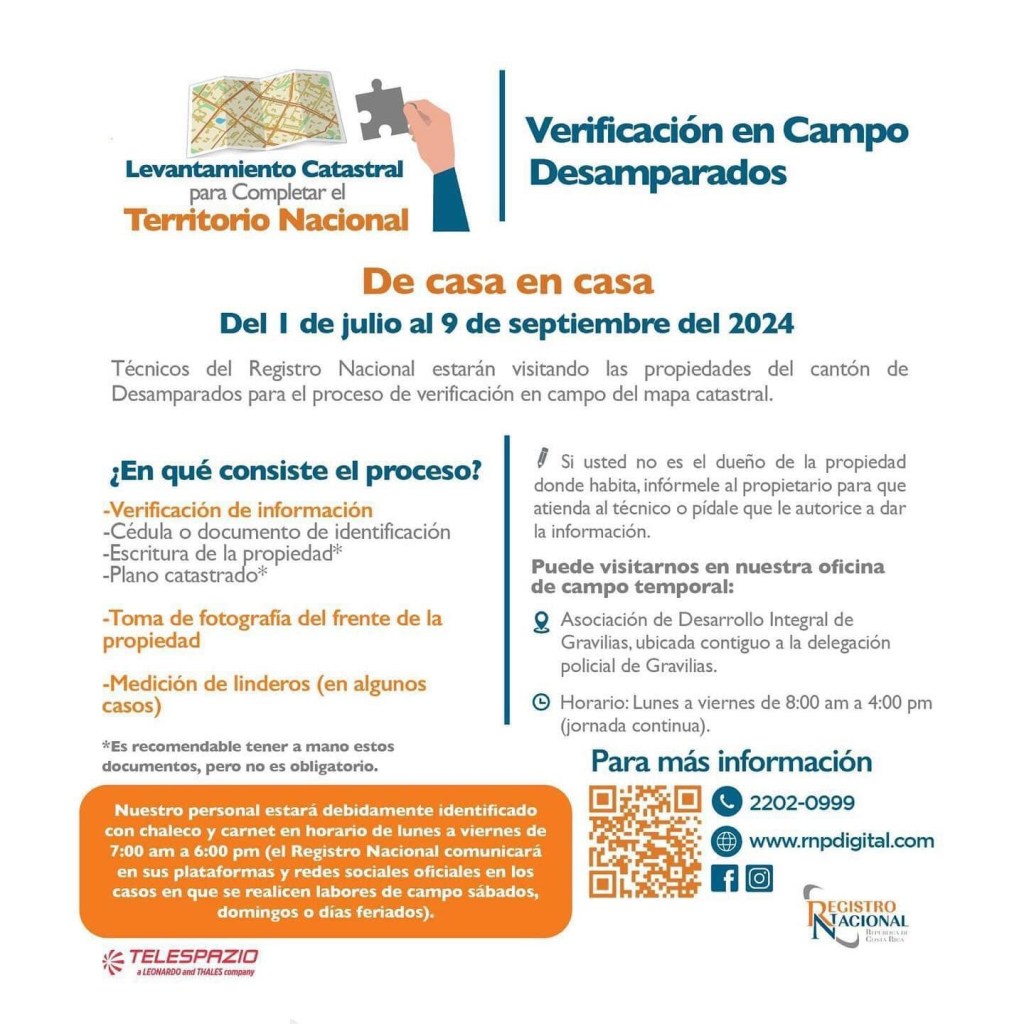 El día de hoy el Registro Nacional a través de su página oficial de Facebook emite un comunicado informando a la población de Desamparados que entre el 1 de Julio y el 9 de Septiembre del presente año van a estar realizando levantamientos catastrales en Desamparados.
